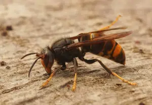- Descrição: Uma vespa de grande porte com um corpo escuro e patas amarelas.